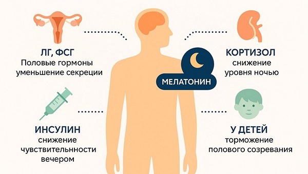 Ночью, когда мелатонин на максимуме, снижается уровень кортизола и частично подавляется выработка АКТГ — это необходимо для восстановления надпочечников и снижения стресса, а также — усиливается ночной выброс гормона роста (GH), особенно важного для детей и подростков.