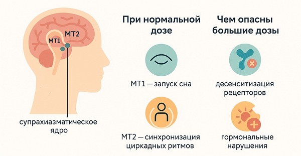Рецепторы MT2 — ключевые для синхронизации биологических часов. При «перегрузке» мелатонином мозг может получить сигнал о ночи в неправильное время, что приводит к смещению времени засыпания, утренней сонливости, нарушению фазы быстрого сна.